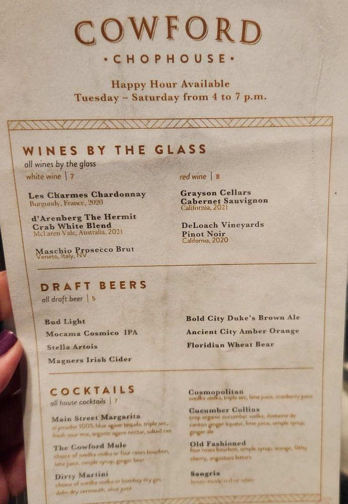Cowford Chophouse, located in Jacksonville, FL, offers a romantic and upscale dining experience with a variety of steaks, seafood, and bars to choose from. The menu includes premium cuts like Filet Mignon, Ribeye, and American Wagyu, along with entrees like Wood-Fired Chicken and Risotto. Indulge in delectable desserts such as Cheesecake and Flourless Chocolate Raspberry Cake. The restaurant also provides a full bar, happy hour specials, and attentive waiter service. Customers rave about the impeccable service, delicious food, and extensive wine list. Whether you're looking for a special date night spot or planning a catered event, Cowford Chophouse impresses with its top-tier offerings and elegant ambiance.